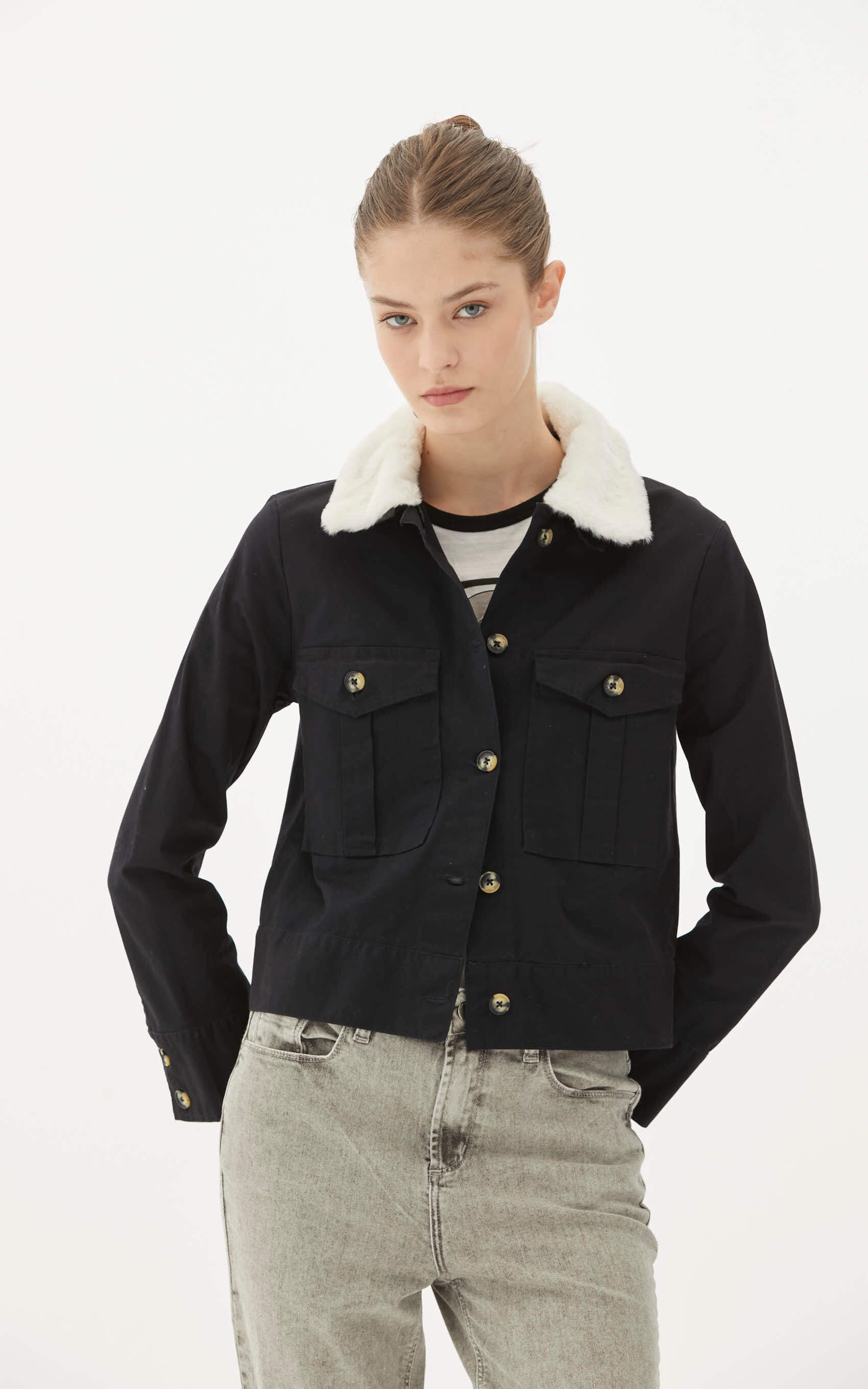Chaqueta de gabardina elastizada con cuello de piel sintética desmontable. cartera a la vista con botones de pasta marmolados, lleva bolsillos plaqué con tapa y botón y charreteras en cintura espalda.
