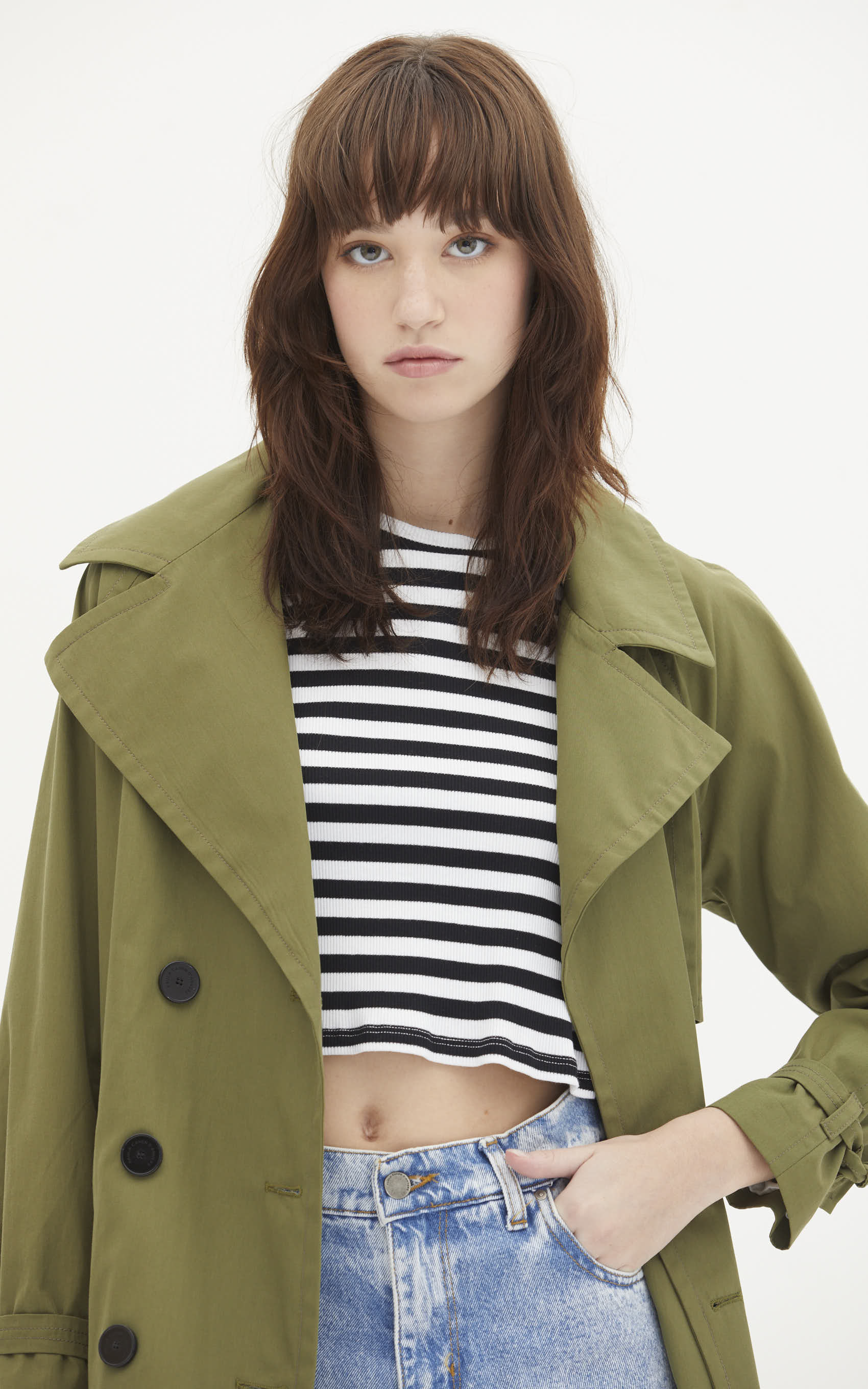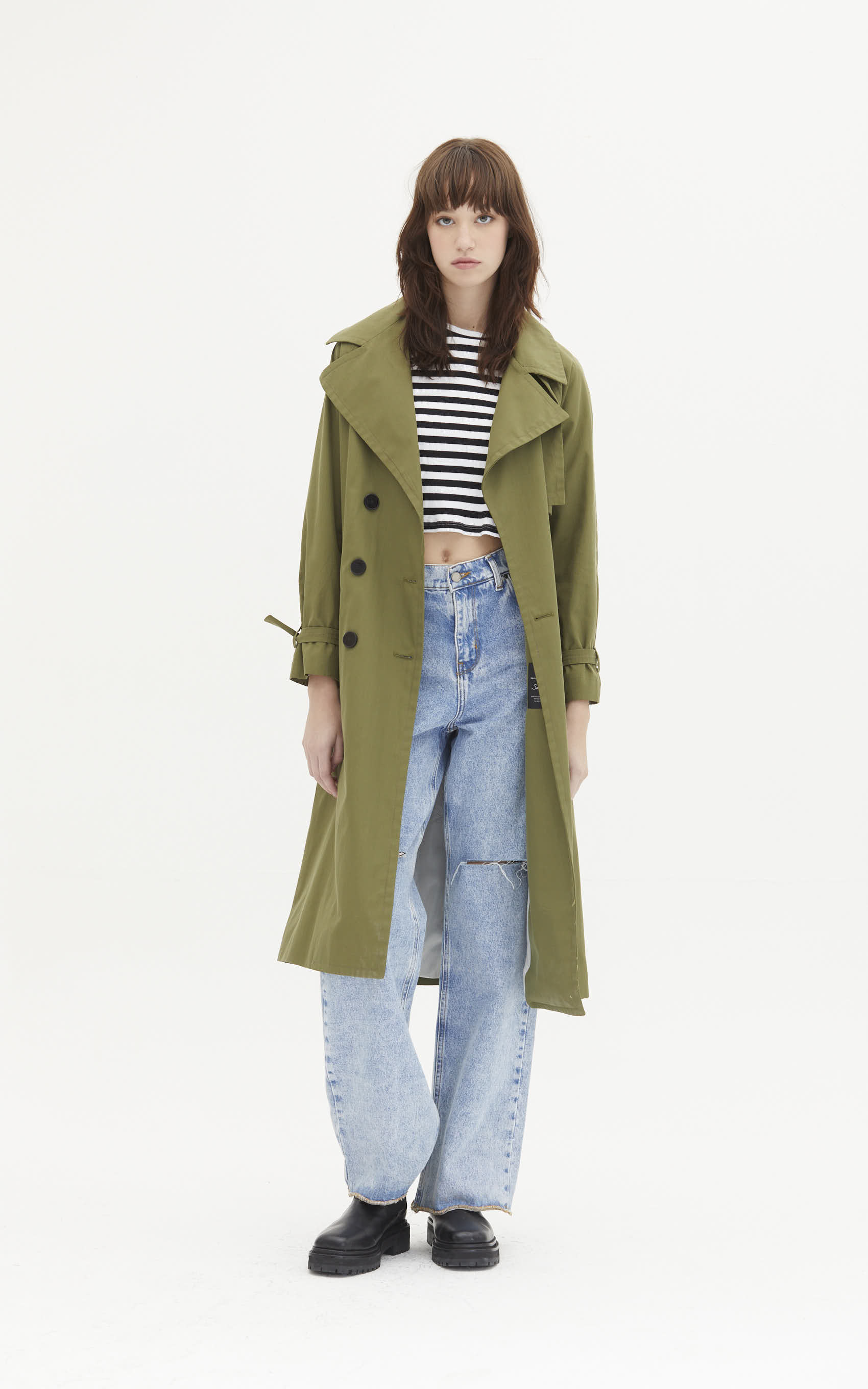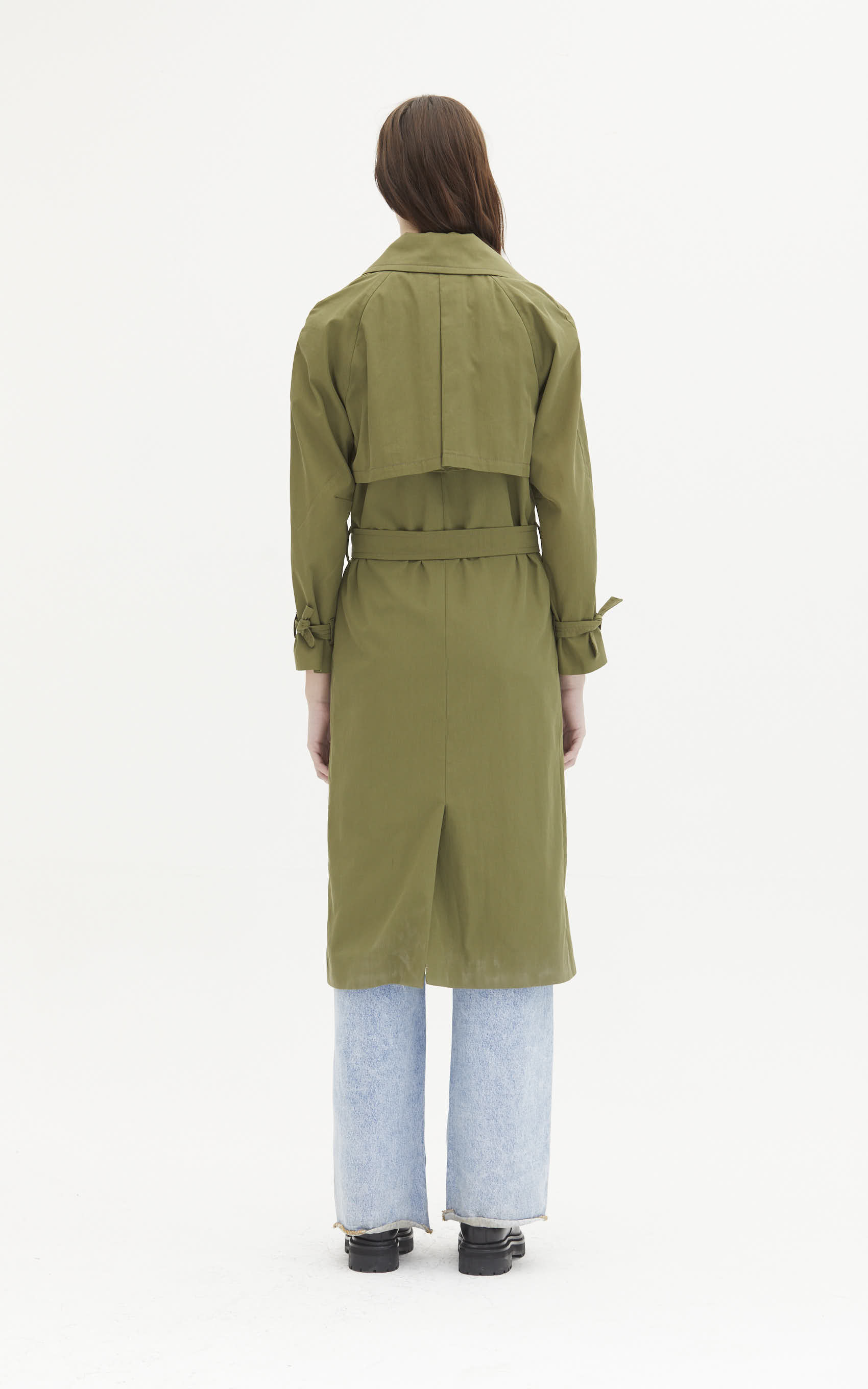 trench largo cruzado de tela plana repelente al agua lleva lazo para ajuste en cintura con hebilla. lleva bolsillos ojales en el frente y tajo en la espalda. forreria de acetato.