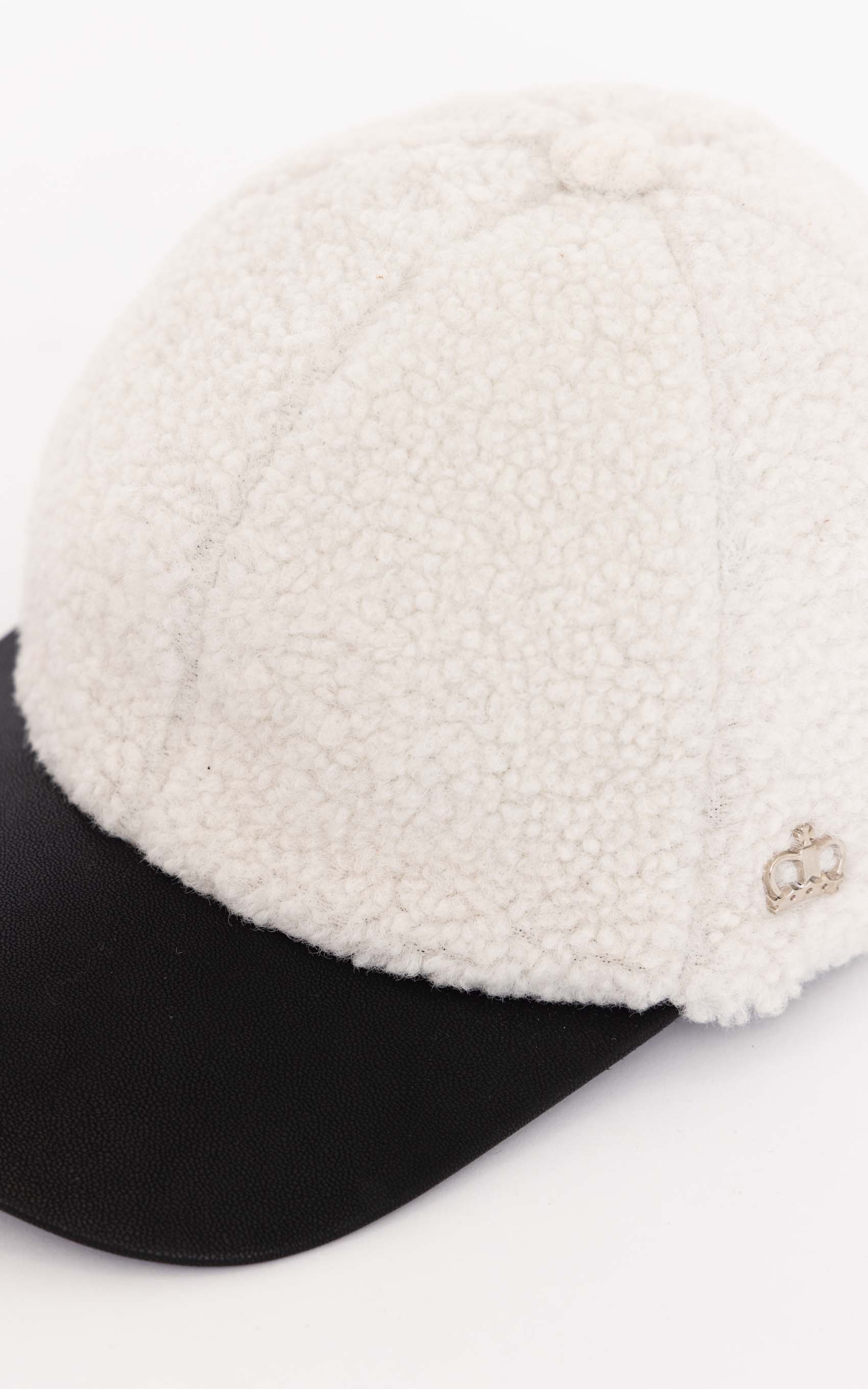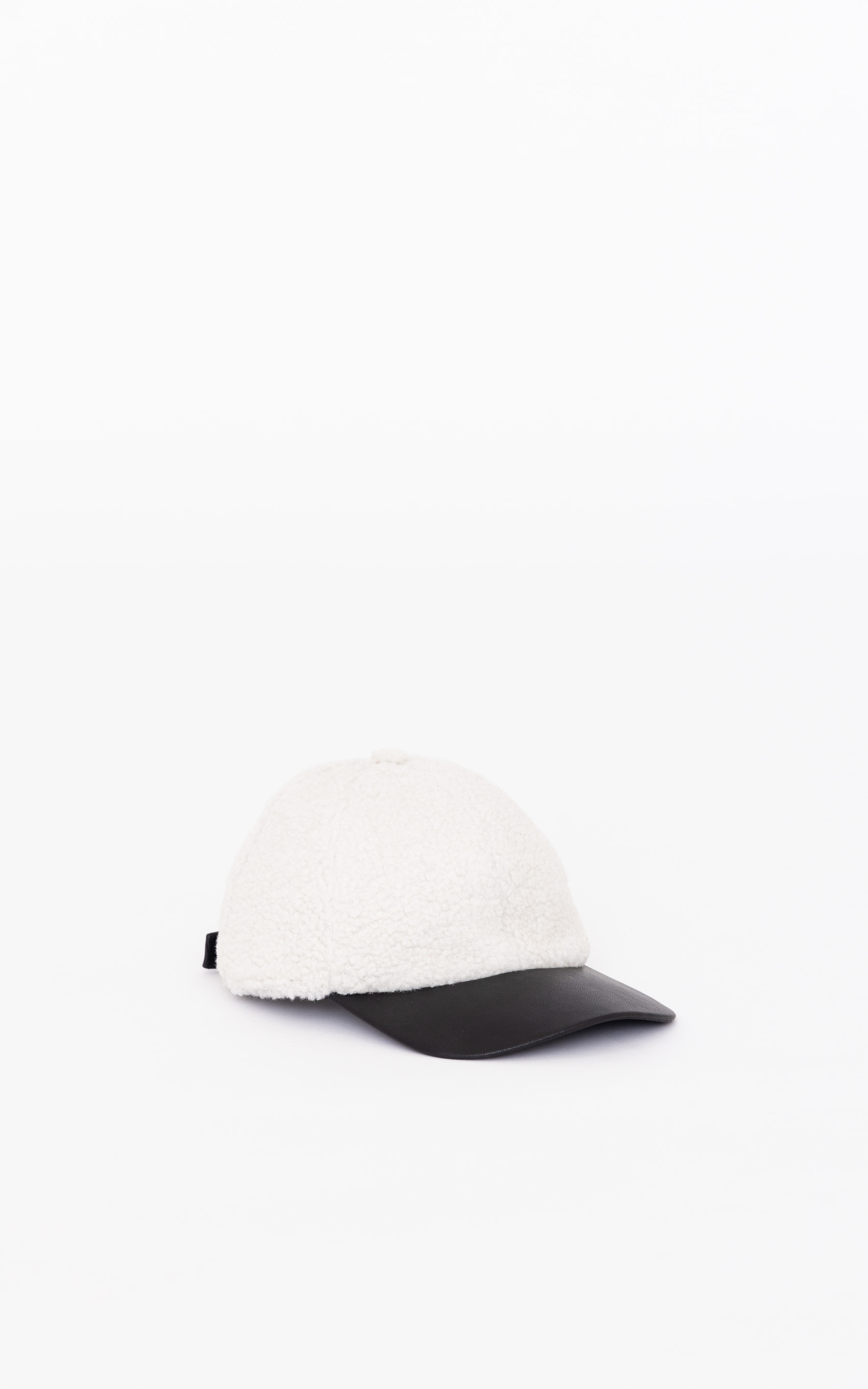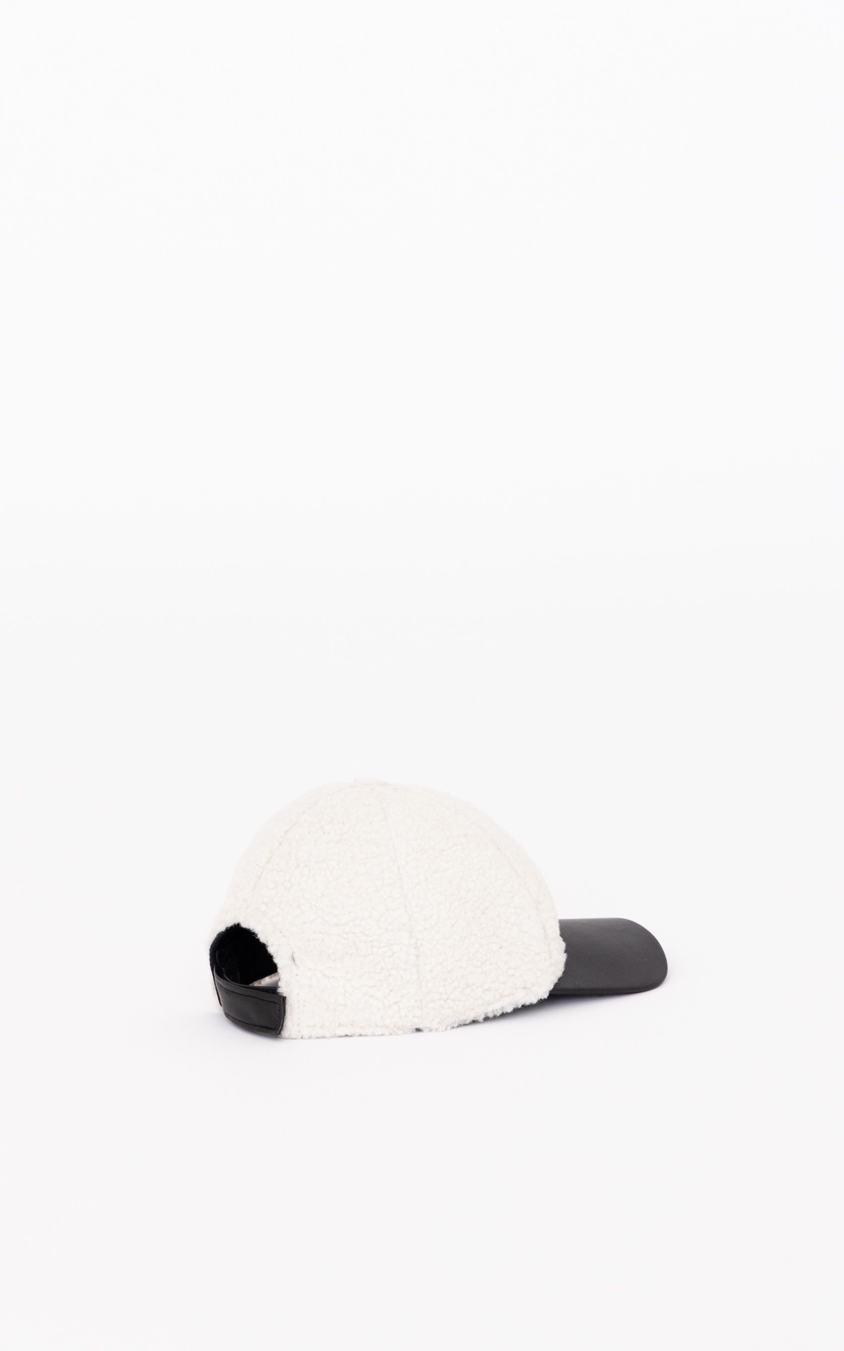 Gorra de corderito sintetico combinada con cuero sintetico en visera y correa para la variante cruda y negra, y gamuza para la variante tostado. tira de ajuste con velcro a tono. lleva remache marcario metálico niquel en lateral. medidas (talle unico): diametro de corona: 60cm/largo de visera(centro).:7,5cm/ largo de correa de ajuste: 8,5cm