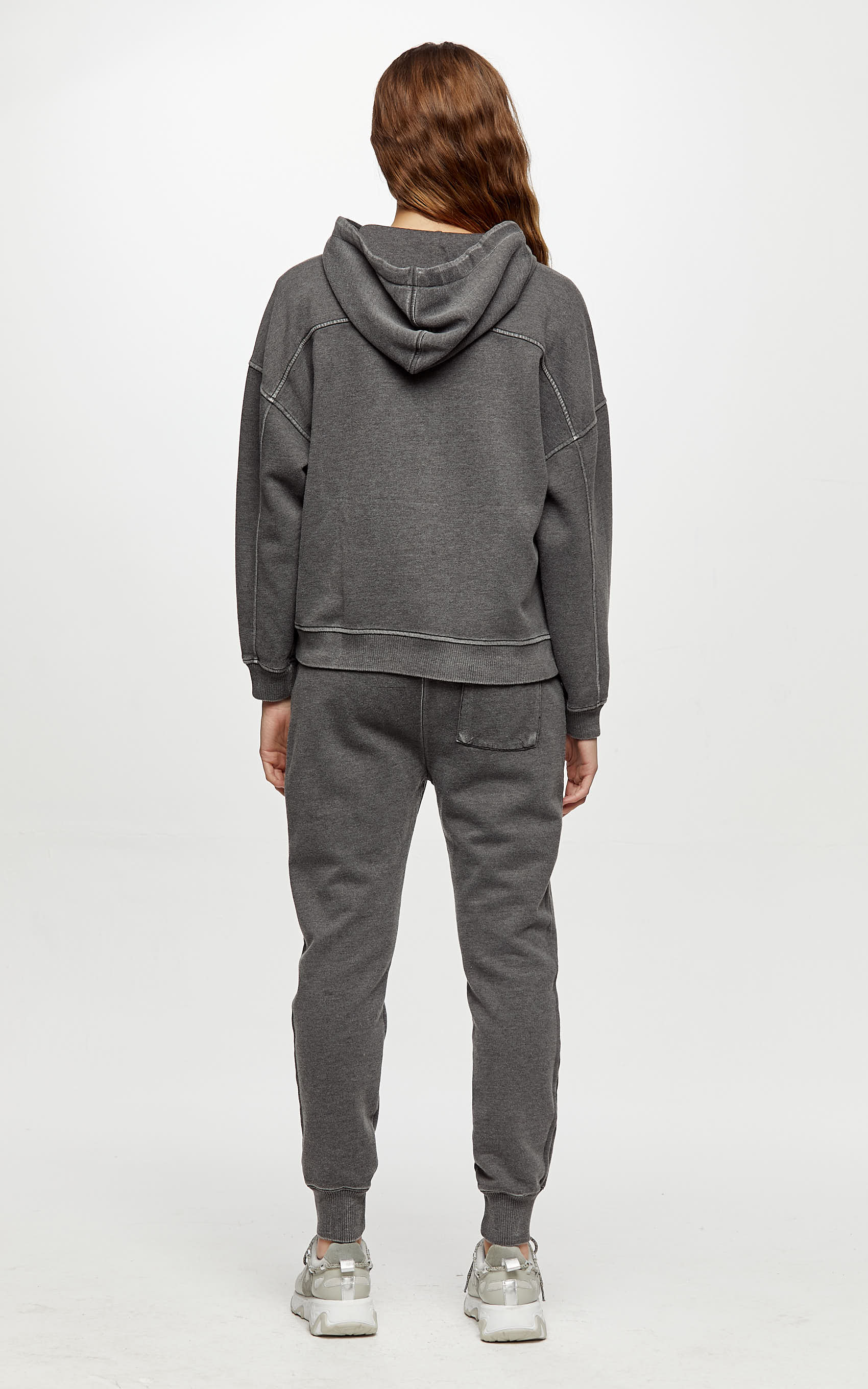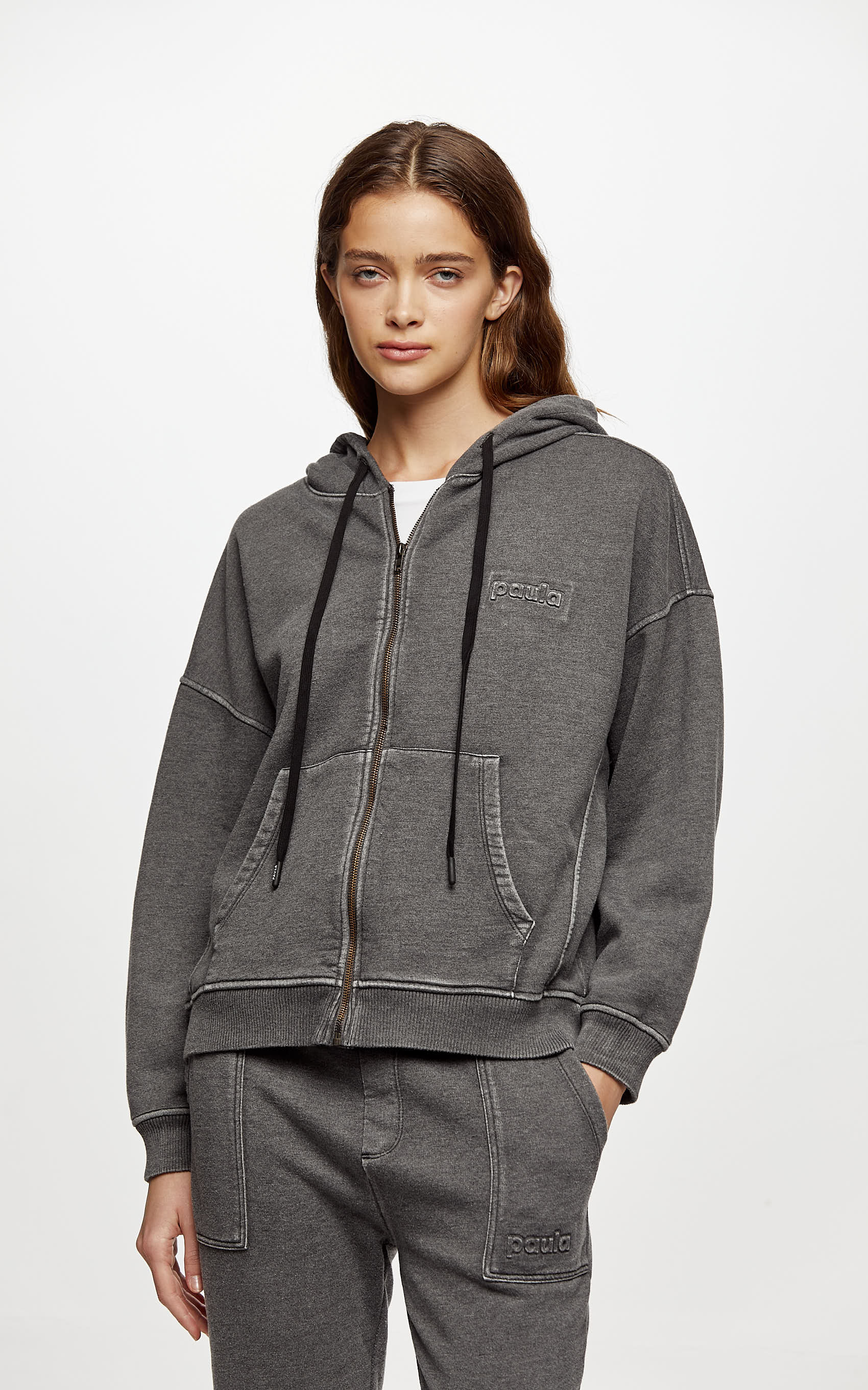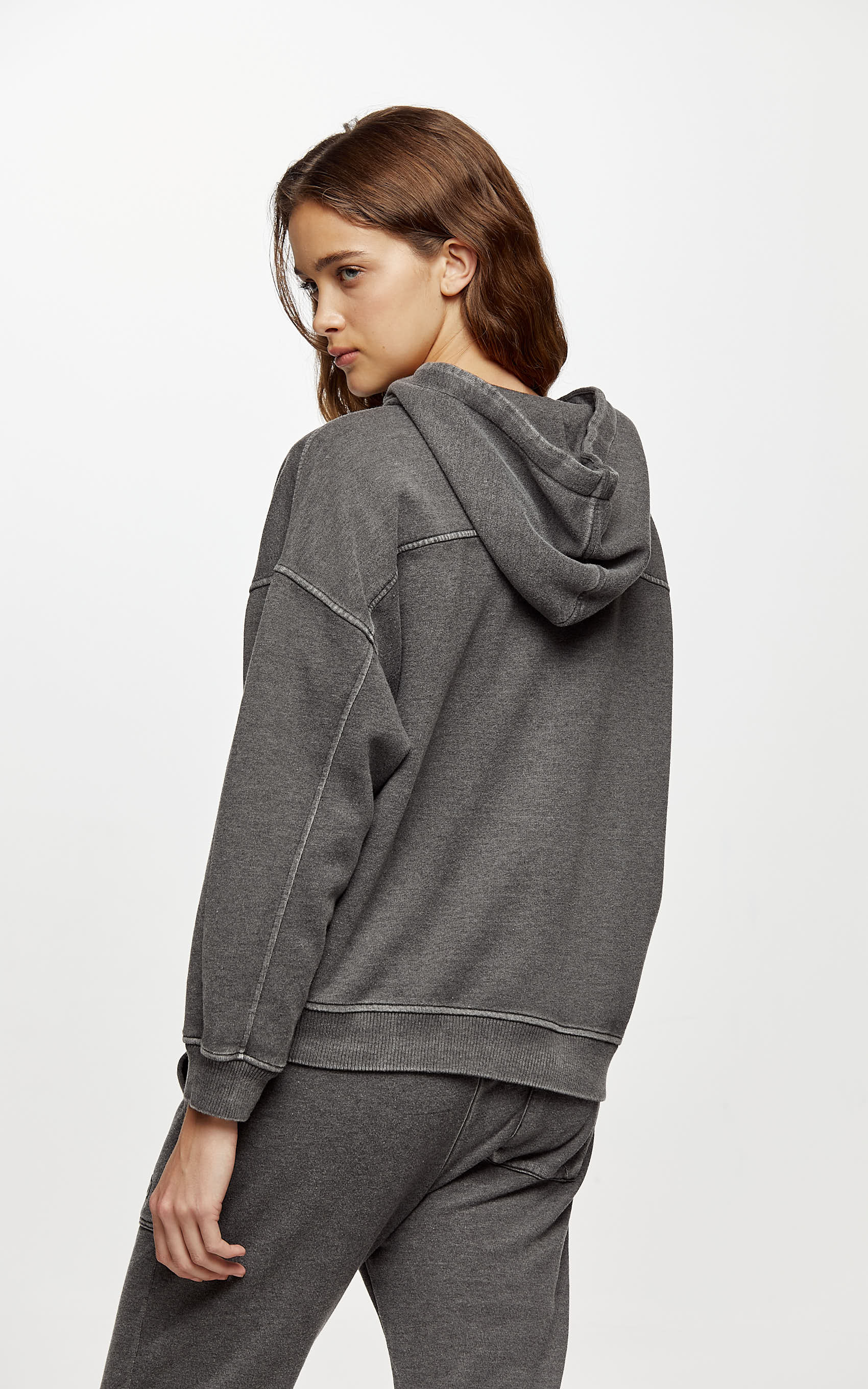 Campera de punto con hombro caído, puños y cintura en rib, capucha forrada en jersey y bolsillo canguro.Lleva logo gofrado en el delantero, corona gofrada en la espalda y lavado croma wash. Producto fabricado en Perú.
