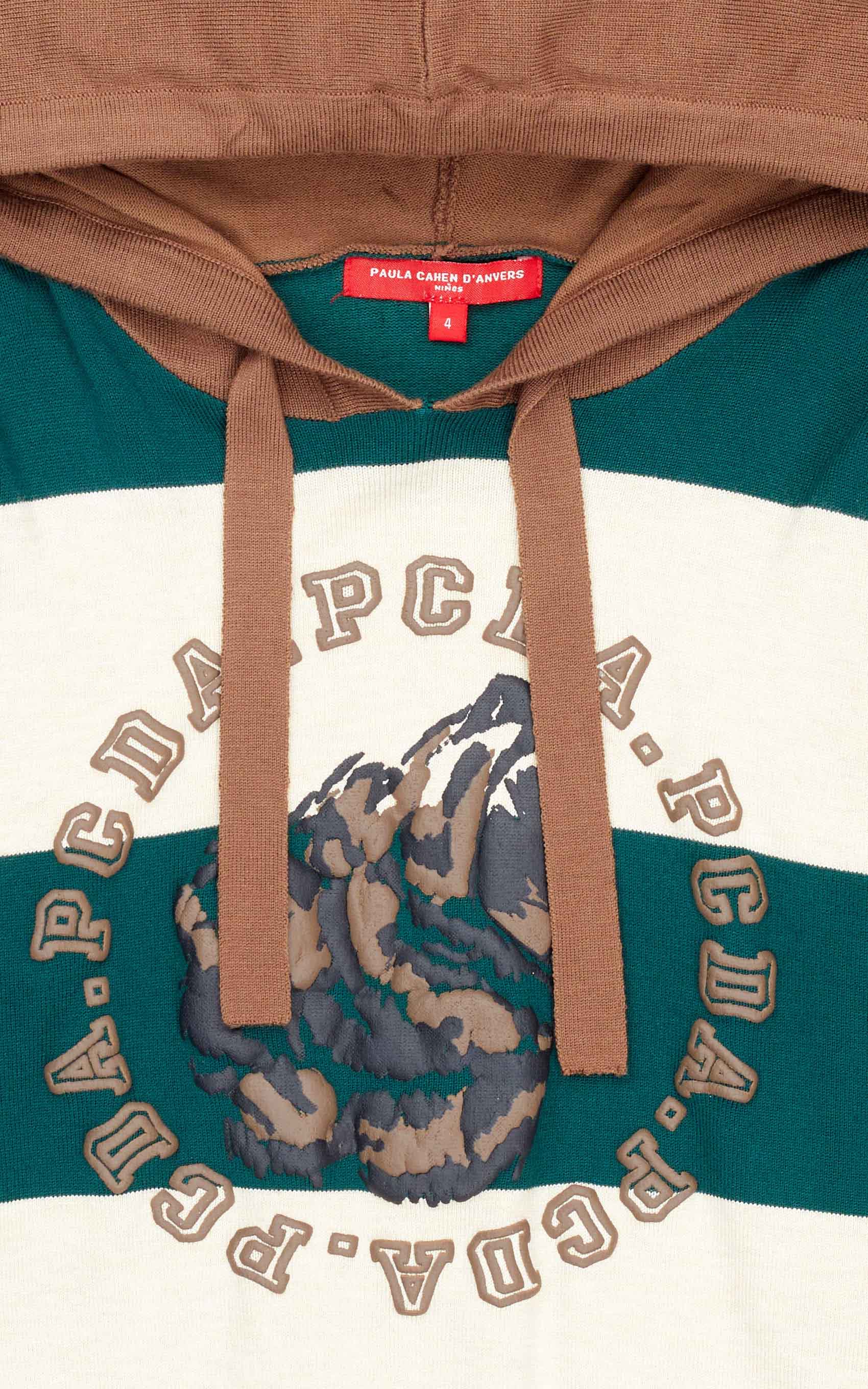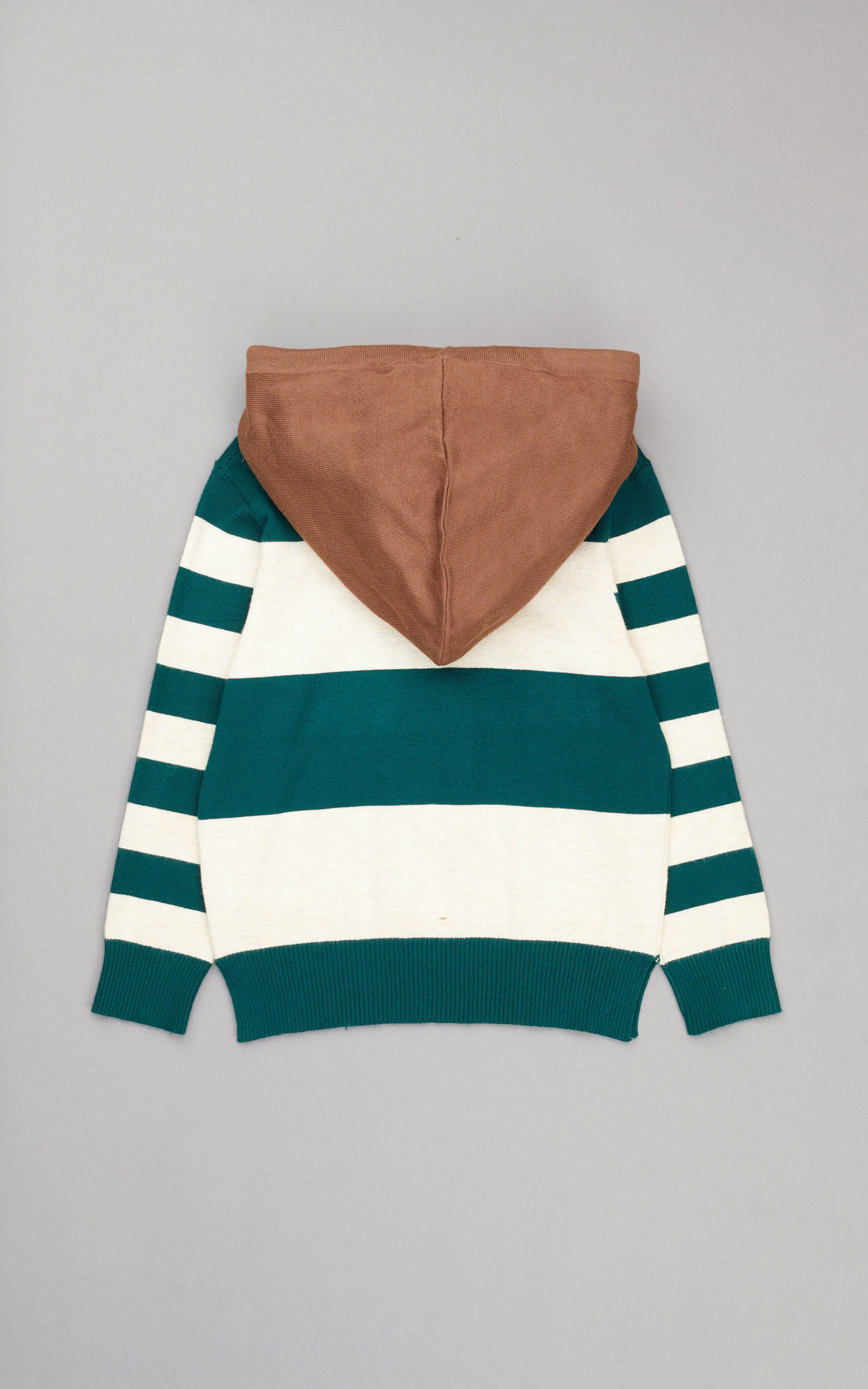 Sweater tejido de punto rayado a dos colores con estampado central en pecho, rayado ancho en cuerpo y rayado mas angosto en manga larga y capucha lisa con cordón a contra tono. Fabricado en Oriente.