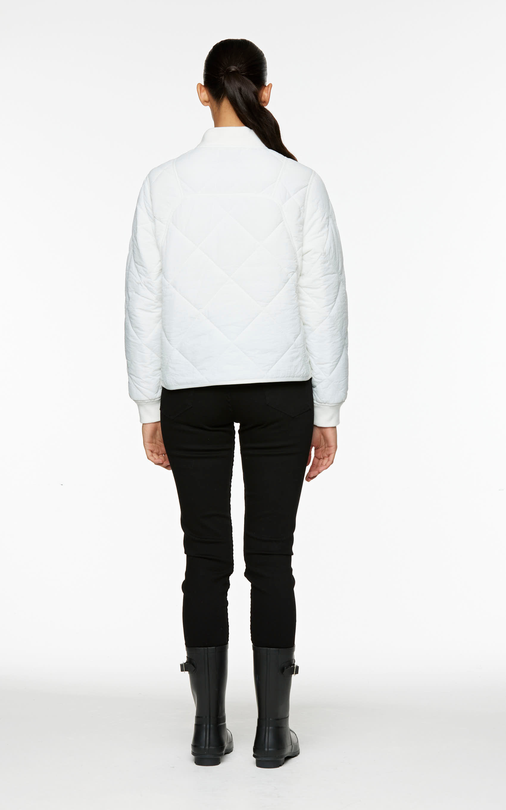 Campera de tela plana matelasse con cuello y puños en rib. Largo por cintura. Lleva bolsillos diagonales en el delantero. Acceso con broches personalizados al tono. Producto fabricado en oriente