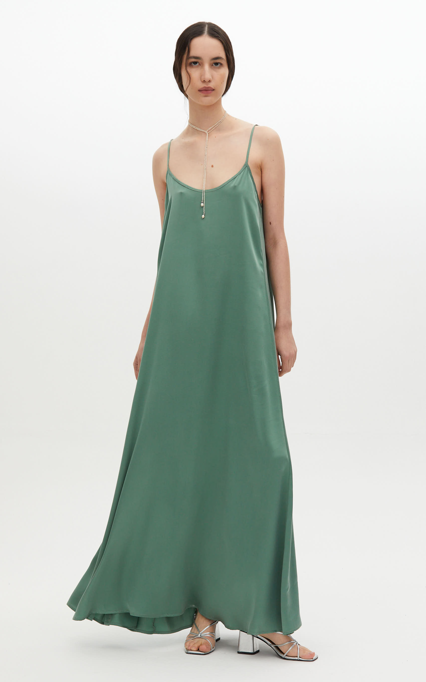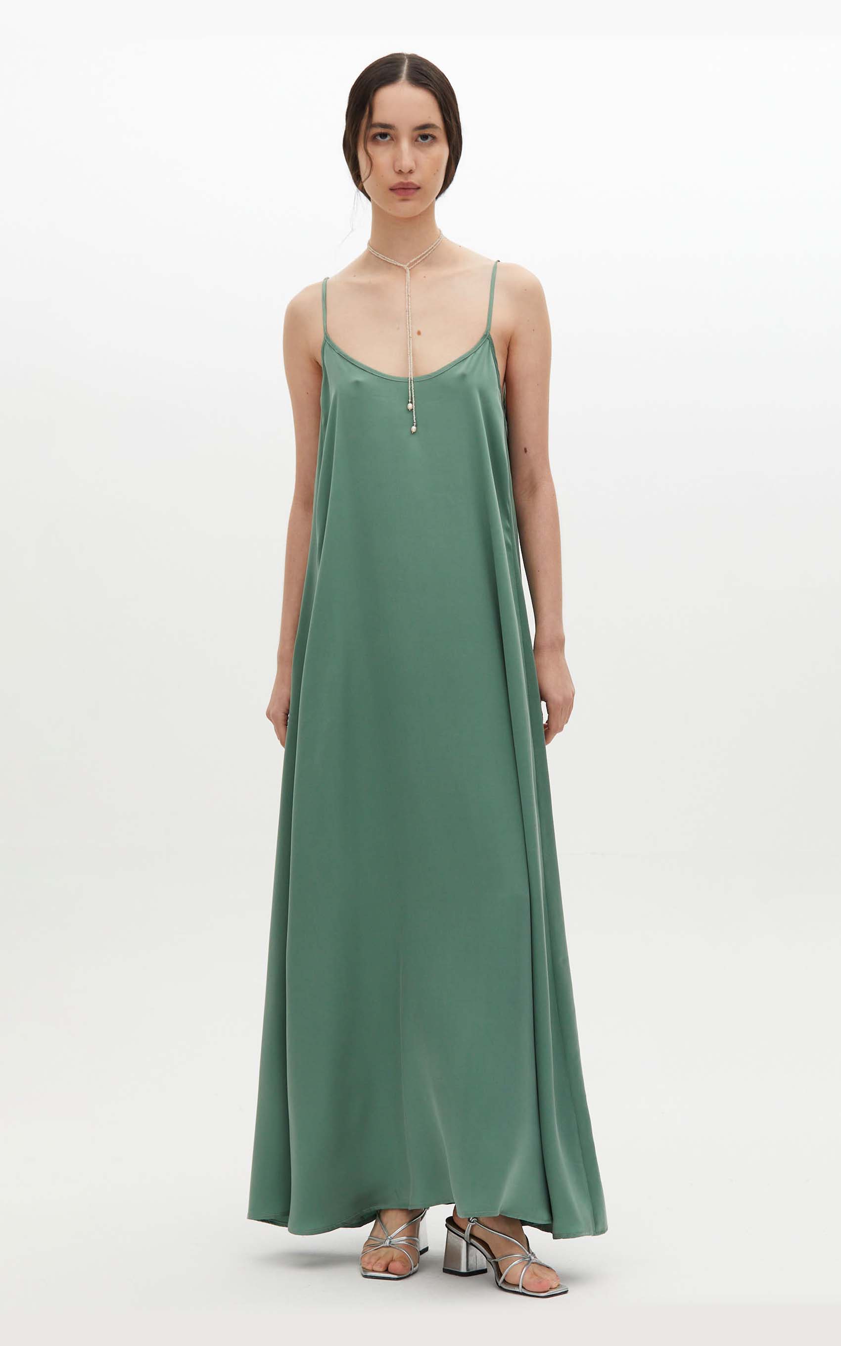 Vestido largo bretelero desarrollado en seda. Escote delantero en "V" espalda descubierta con vivo horizontal . Lleva tajos laterales .TEXTIL FABRICADO EN ORIENTE
