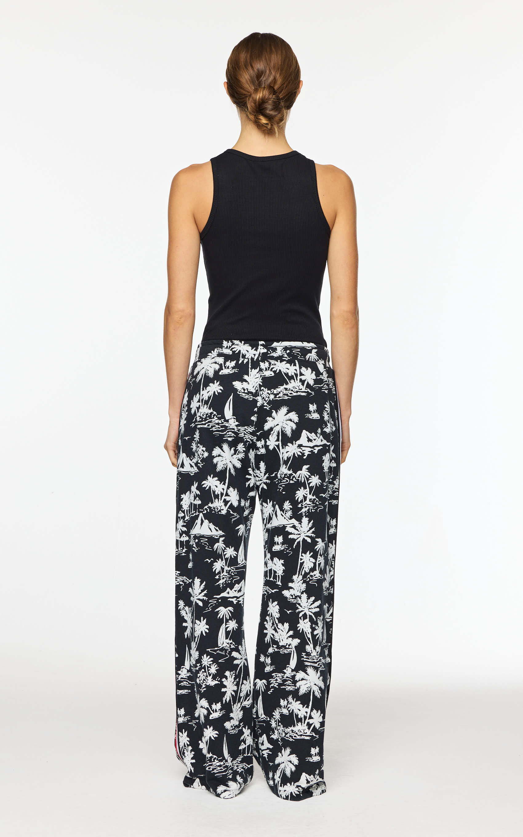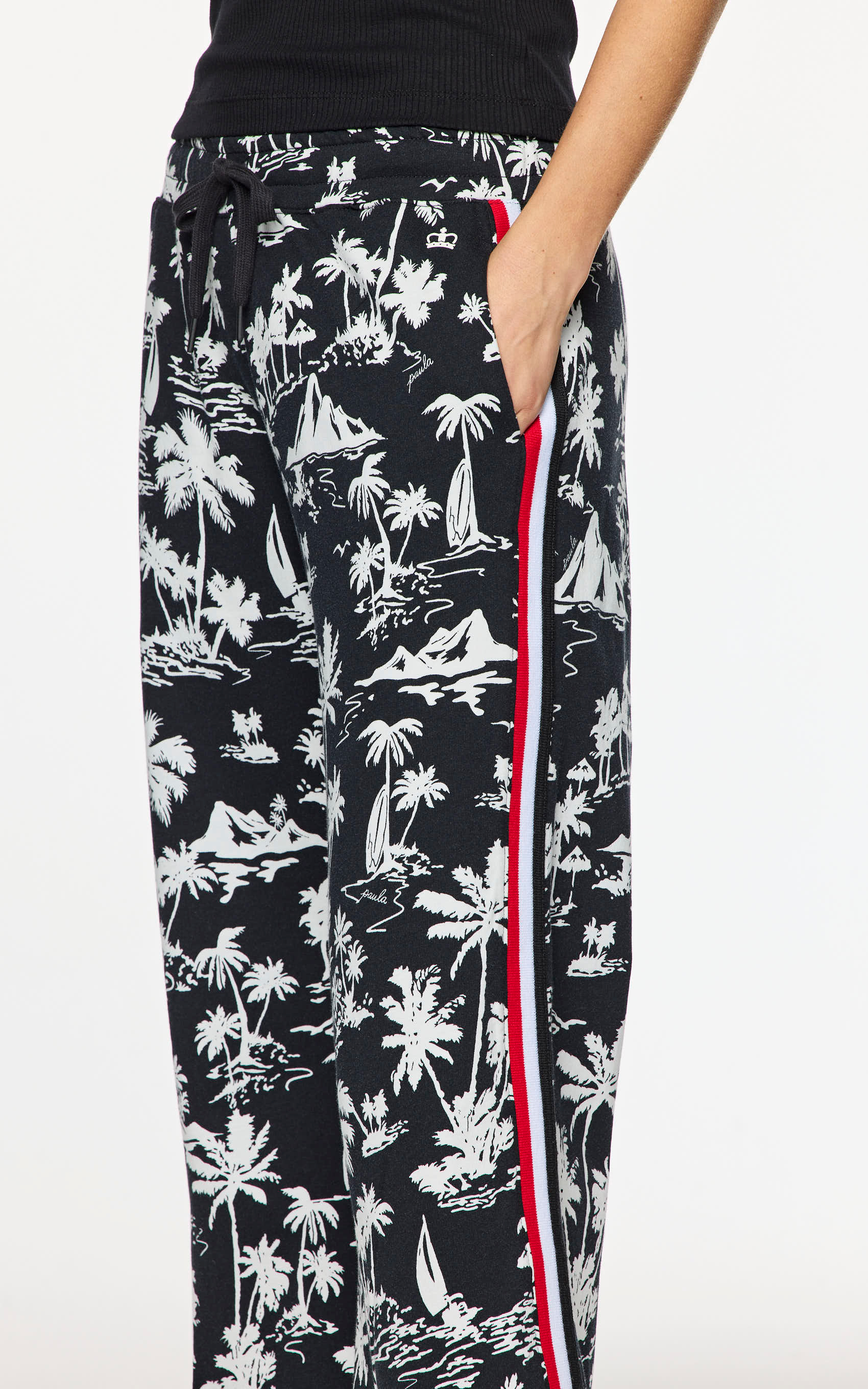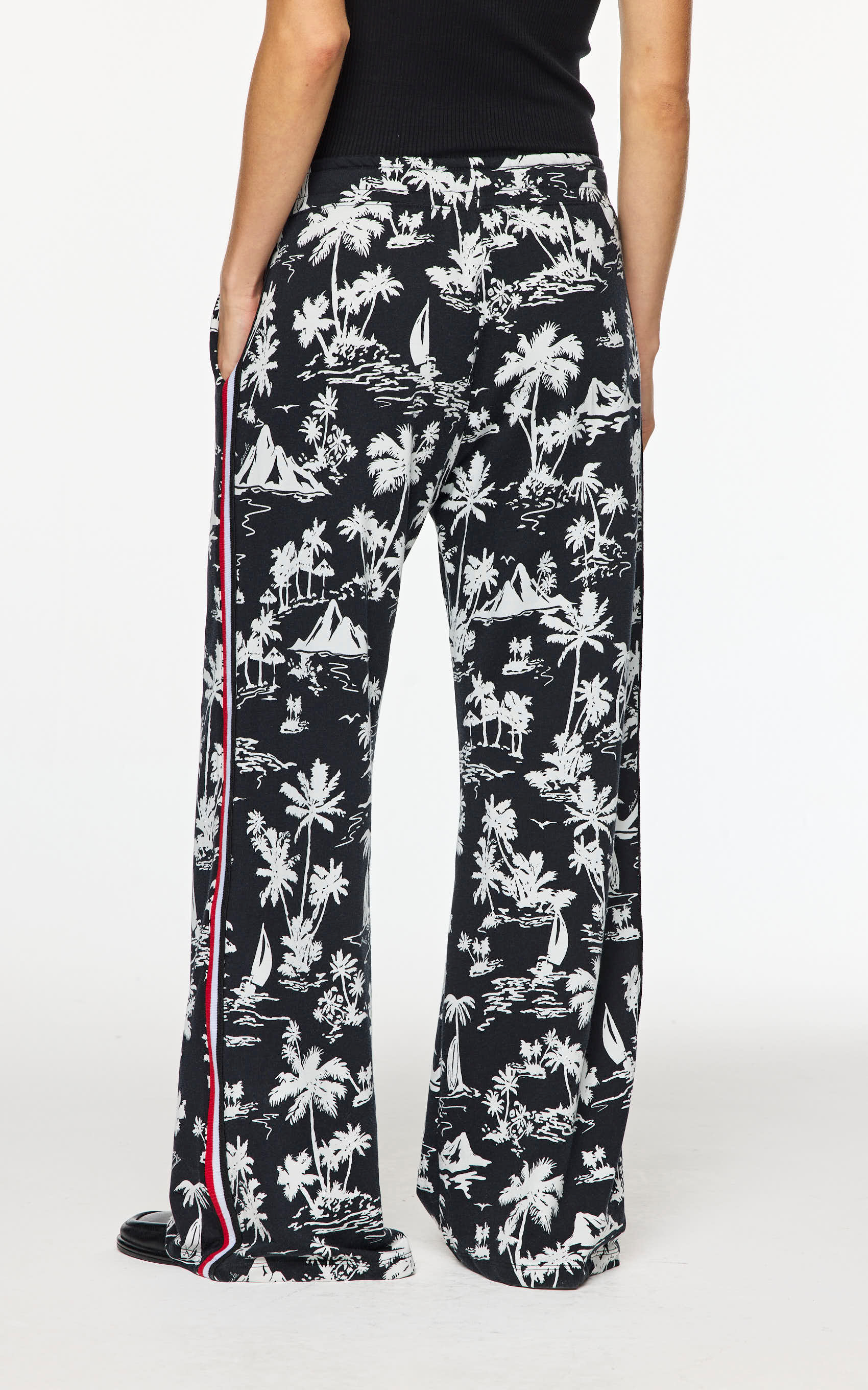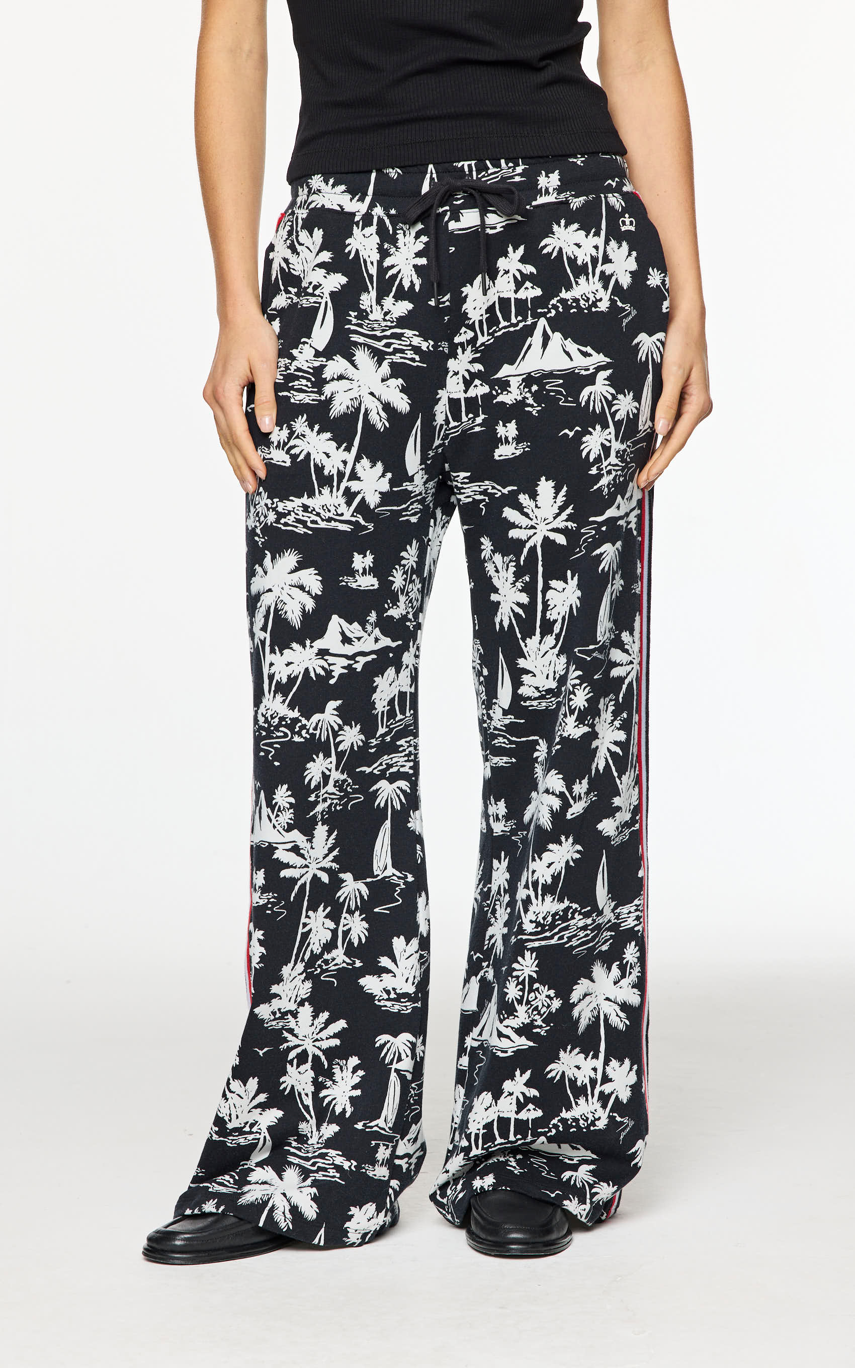 Pantalón de punto full print, calce flare, lleva una cinta tejida a 3 colores en el lateral de la pierna, cordón para ajustar la cintura y corona con relieve en el delantero. PRODUCTO IMPORTADO