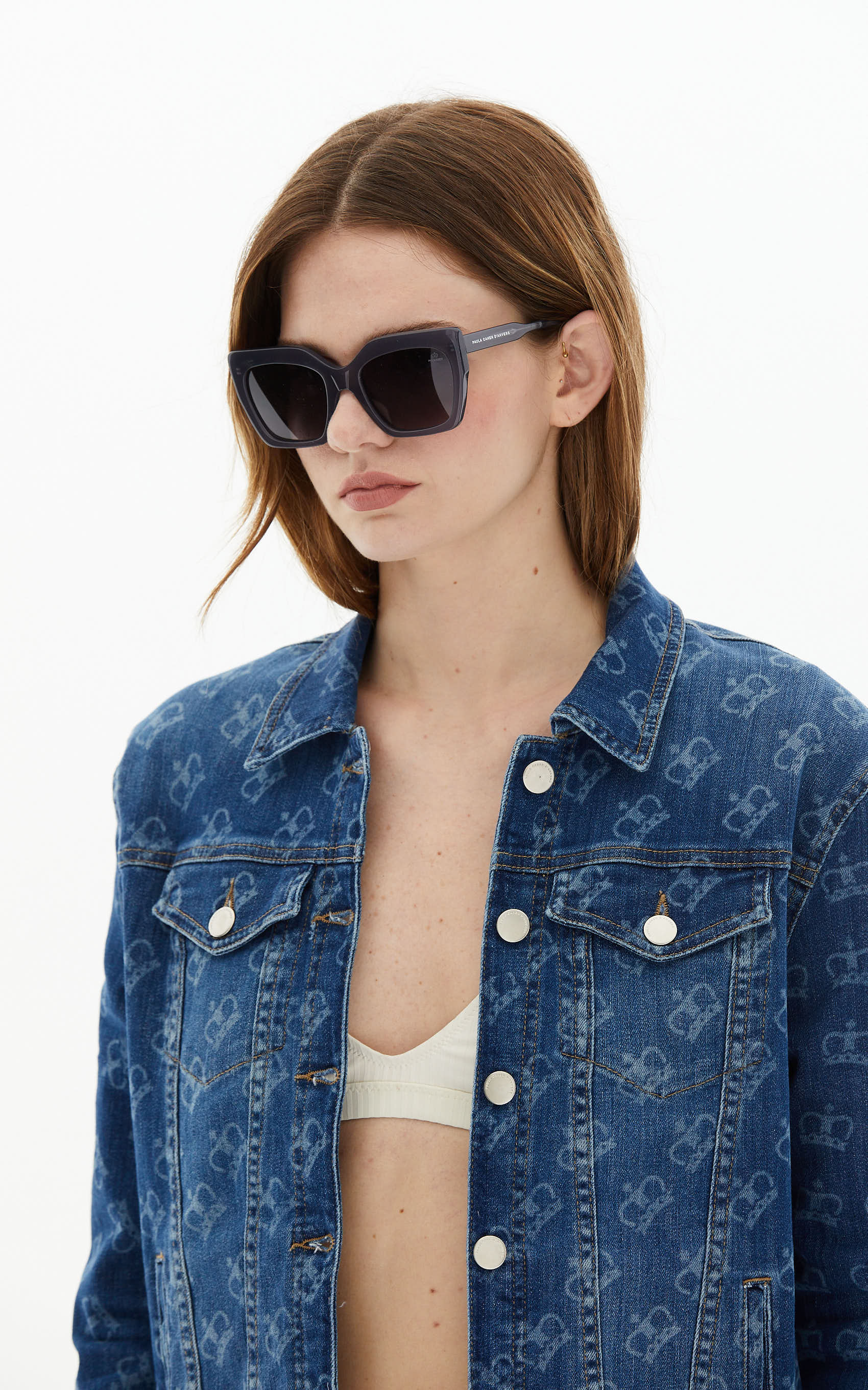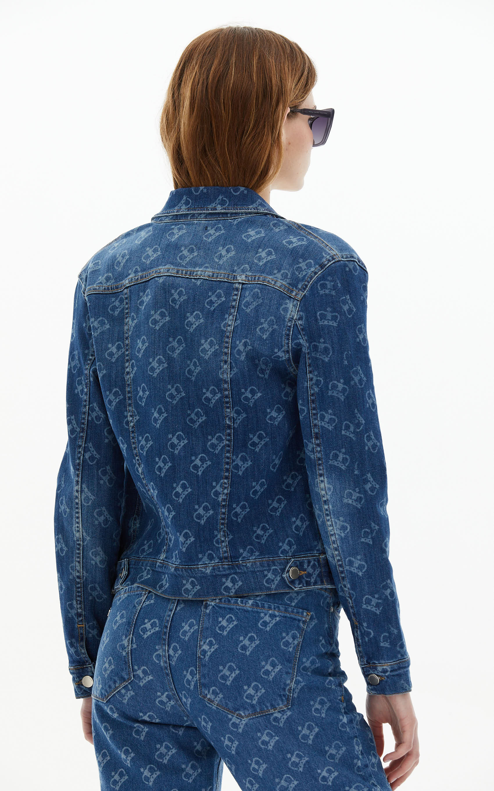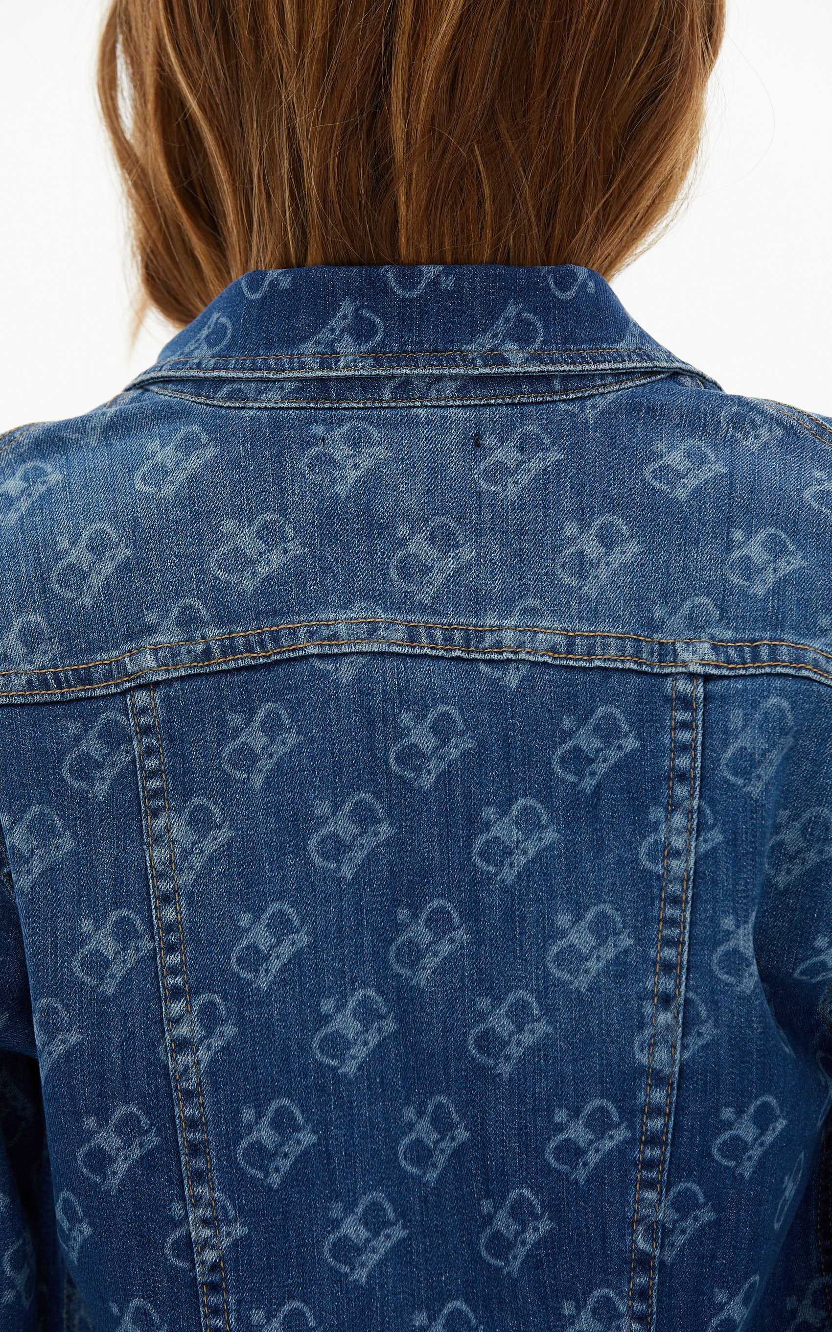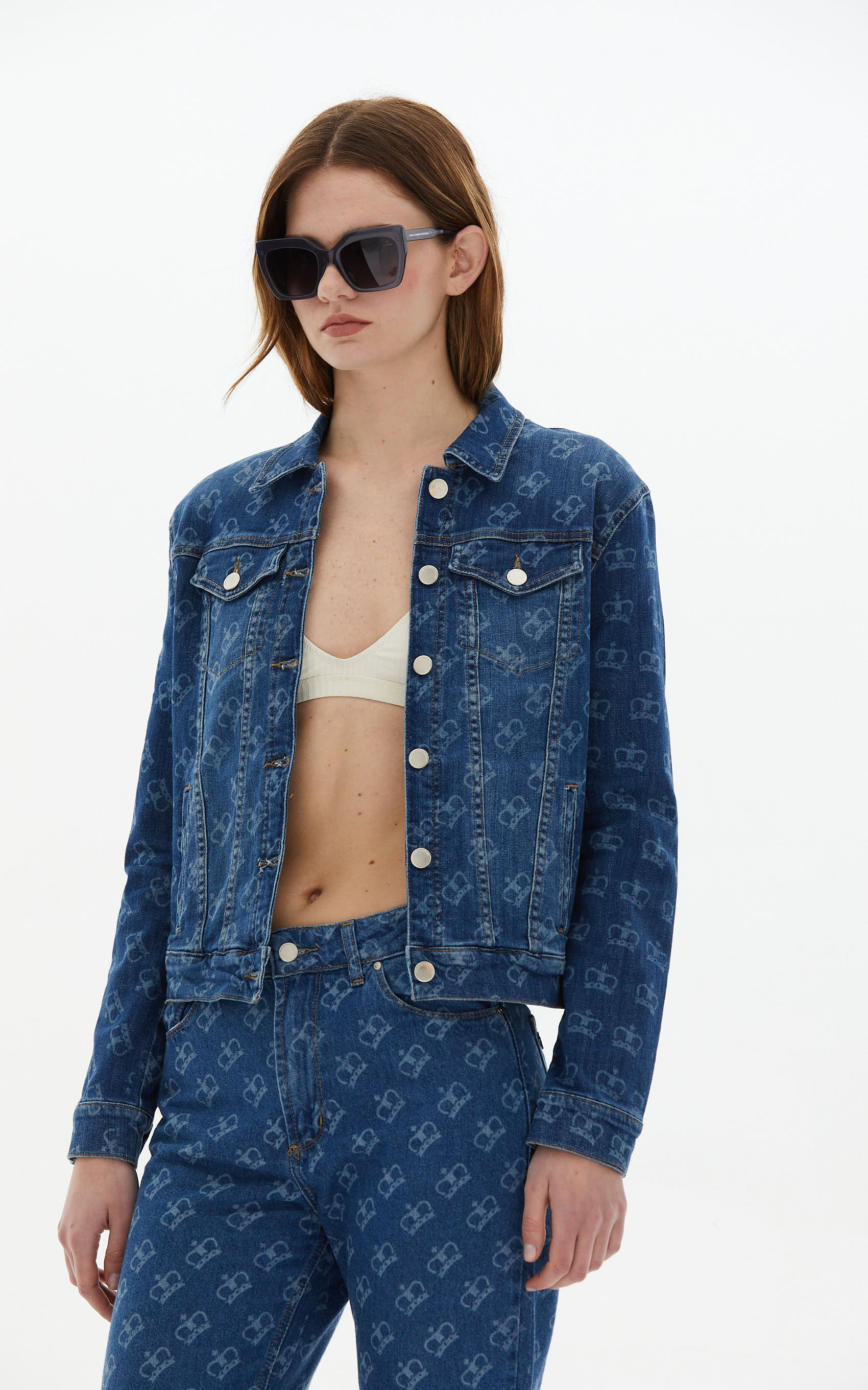 Campera de jean manga larga, largo por arriba de la cadera, con bolsillos delanteros con tapa en pecho y bolsillos ojal en cintura. Estampado laser full coronas.